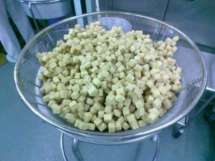 今日の煮物は、高野豆腐がたっぷり入っています。食べやすくするために、水で戻してから片栗粉をまぶして揚げ、煮物に入れました。一度揚げることで、もちもちした食感になります。「高野豆腐って何?」とつぶやいている生徒も見かけました。普段食べる機会の少ない生徒にも、給食で味わってもらいたい食材です。