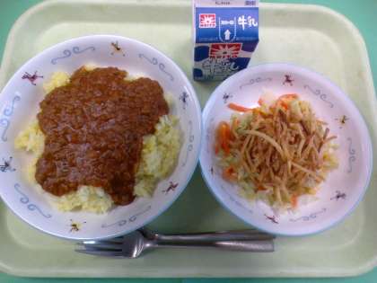 キーマカレーの「キーマ」とは、ヒンディー語で「細かい」や「ひき肉」という意味です。その名の通り、キーマカレーは、ひき肉と野菜をカレー粉などのスパイスで炒め煮にして作ります。今日は食物繊維豊富なごぼうと、鉄分豊富なレンズ豆を入れました。スパイスを炒めるよい香りが朝から学校に広がって、給食を待ち遠しく感じる生徒がたくさんいました。