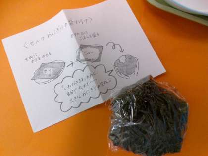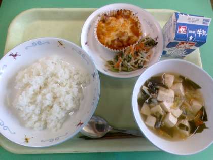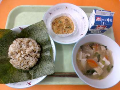 練馬区では、毎年「朝ごはんコンクール」を行っています。学園中では、1年生が夏休みの宿題で取り組みました。練馬区の食材と豆・豆製品を使った献立がテーマで、それぞれ工夫して、素敵な献立を作ってくれました。1年生が考えた献立をアレンジして、今日と明日の給食に登場します。今日は銅賞を受賞した献立のアレンジです。おにぎりの代わりに、給食ではセルフおにぎりにしました。自分でごはんを大きなのりに包んで、ビックおにぎりを作りました。