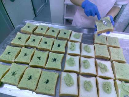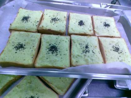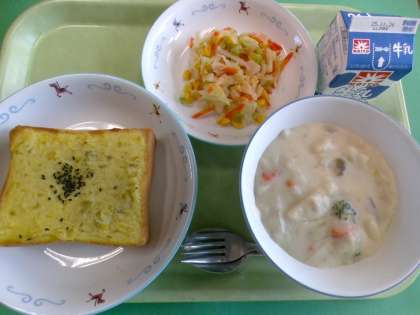 旬のさつまいもを使って、おさつトーストを作りました。蒸したさつまいもをつぶして、砂糖と牛乳、バターを混ぜて練り、パンの上にのせて焼きました。給食室ではおさつトーストを焼くときのよい香りがいっぱいに広がりました。給食から季節を感じてもらえたらうれしいです。