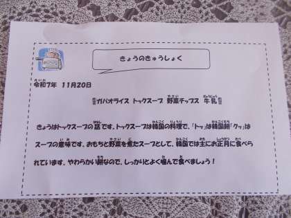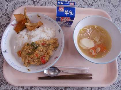 今日の給食は、ガパオライス、トックスープ、野菜チップス、牛乳でした。