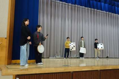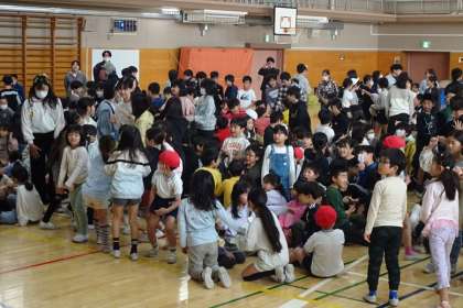 朝の時間は、集会委員会の子供たちが考えた「サイコロ集まれ集会」でした。子供たちはバラバラに分れて、2つのサイコロの目を合わせた数だけ集まります。