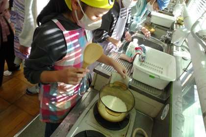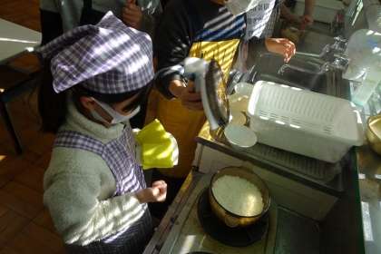 本時は、ご飯を炊くことをねらいとしていました。お米をとぎ水を入れてタイマーセット。時間になってふたを開けたらほんわかと甘い香りが…とても幸せな気持ちになりました。