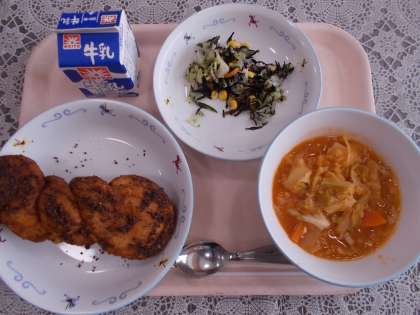 今日の給食は、ココアごま揚げパン、ひじきとコーンのサラダ、ボルシチ風トマトスープ 牛乳でした。