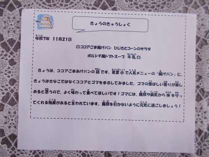 今日は、ココアごまあげパンの話です。夏雲小で人気メニューの「揚(あ)げパン」に、今日はきなこではなくココアとゴマをまぶしてみました。ゴマの香ばしい香りが楽しめると思うので、よく味わって食べてほしいです!ゴマには、風邪や病気から体を守ってくれる効果があると言われています。風邪を引かないように元気に過ごしましょう!