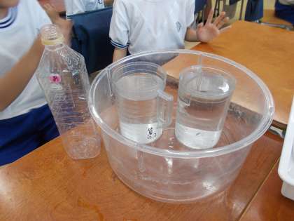 算数の「どちらがおおい」の学習では、形のちがうペットボトルを使って、水のかさをくらべる学習をしました。見た目の大きさだけでは、分からないため、実際に水を入れて体積を直接比べたり、同じ大きさの容器に移しかえて比べたりしました。「こっちのほうが多いと思う!」「あれ?予想とちがうな!」と、子供たちは興味をもって学習に取り組んでいました。実験を通して、水のかさの比べ方を楽しく学ぶことができました。