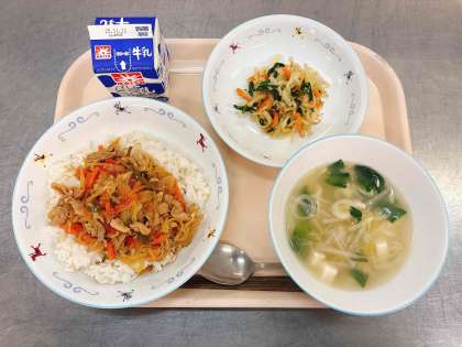プルコギ丼、塩ナムル、コムタンスープ、牛乳