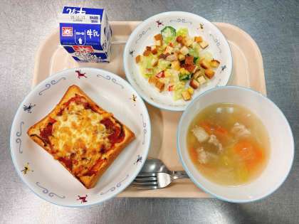 ピザトースト、カリカリクルトンのシーザーサラダ、野菜たっぷりポトフ、牛乳