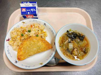 きびチャーハン、ジャンボ揚げ餃子、中華スープ、牛乳