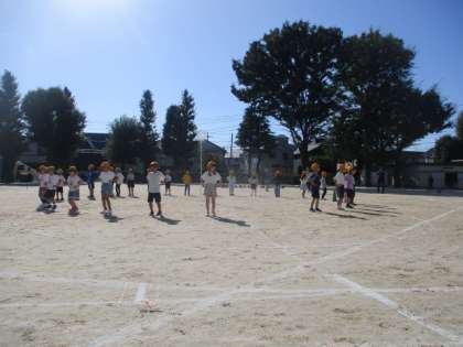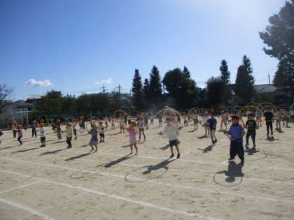 1、2年生の運動会の表現練習を校庭で行っていました。プラフープを使って表現する場面もあります。みんなで色とりどりのフラフープで花を作ります。一人の表現と全体の表現があります。
