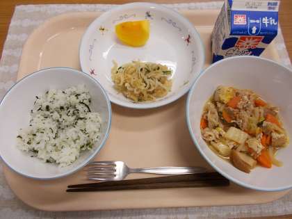 【献立】わかめごはん・牛乳・豚肉のすきやき風煮・水菜のはりはり漬け・くだもの(柿)