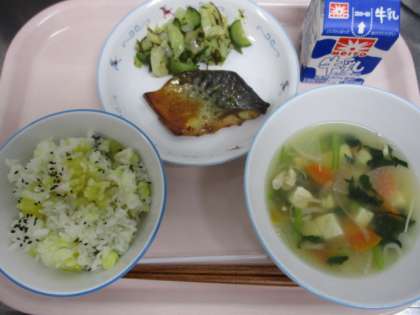 今日の献立は「さつま芋ご飯・さばのにんにく味噌焼き・塩昆布和え・うすくず汁・牛乳」です。