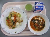 今日の中華丼は、具だくさんです。肉、うずらの卵、えびのほかに、野菜もたっぷり使っています。ごはんと一緒にもりもり食べてくださいね。