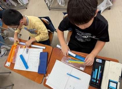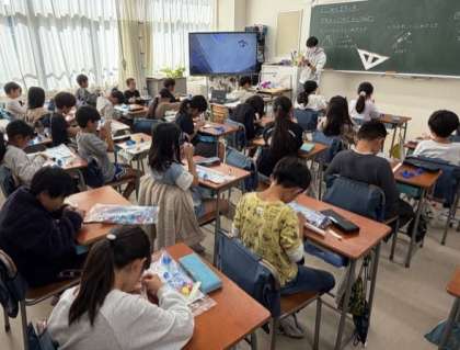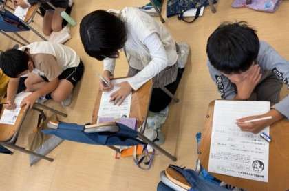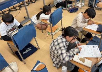 「剣の舞」を聴いて、好きな部分とその理由をワークシートに書きこんでいます。これから、曲の楽しさを友達に伝えていきます。