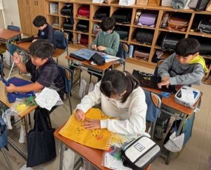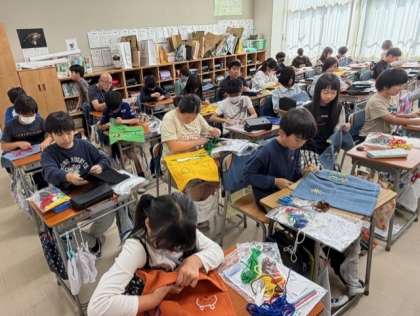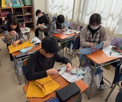 布を折り曲げて固定し、ミシンで縫っています。子供たちも、先生も、一所懸命です!
