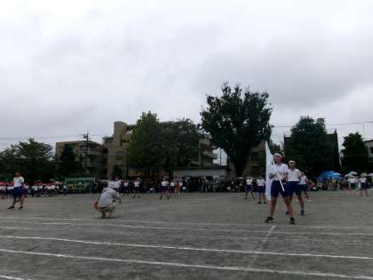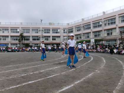 カーブを曲がってからの直線が長いですね。 しかし、腕を思い切り振って、ゴールを目指しました。 5年生のスピードに乗った短距離走!速かったです。 10月28日(火)運動会 団体競技 1・2年生