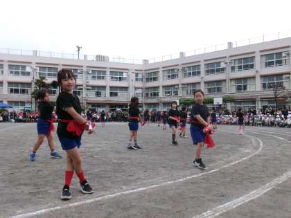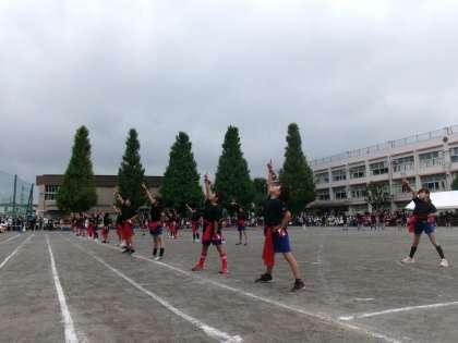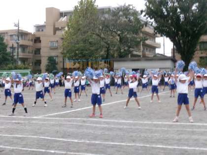 「玉入れ」 しかし、ただ玉入れをするだけではありません。 ♪チェッチェコリ、チェッコリのダンスをする場面、玉入れをする場面と、 忙しいです。 かわいくダンスを踊り、会場をわかせました。 そして、玉入れのときには、真剣にかごにめがけて紅白球を投げ入れます。 結果は、 赤白両者引き分け! 10月28日(火)運動会 団体競技 5・6年生