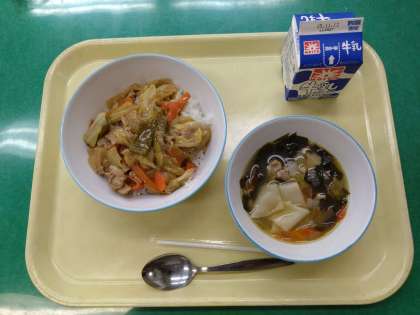 606キロカロリー 今日は練馬区で採れたキャベツを使った「回鍋肉丼」です。練馬区の全小中学校で一斉に練馬区で作られたキャベツを使用した給食を行っています。この練馬区で作られているキャベツは「ねり丸キャベツ」と呼ばれ、ブランド化されています。また、都内で練馬区が一番多くキャベツを作っています。 さつまいも