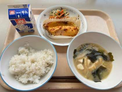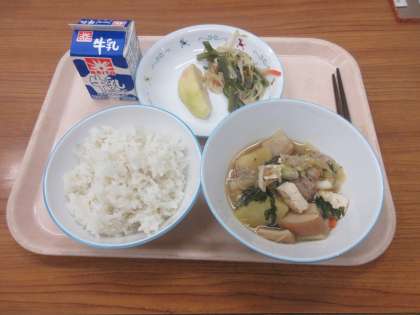 麦ごはん、魚の黄金焼き、みぞれあえ、みそ汁 今日は、完食キャンペーン最終日でした。 今日の完食対象メニューは「みぞれあえ」です。 「みぞれあえ」は、二十四節気のひとつである「大雪(たいせつ)」に ちなんだ料理です。 大雪とは本格的に冬が到来する頃の事で、この頃から山々は雪に覆われ、 平野にも雪が降り積もり始めます。クマも冬眠に入る頃と言われています。 今年は12月7日が大雪に当たります。 昨日から気温が下がってきましたが、冬ならではのおいしい 食べ物も沢山あります。冬の寒さを楽しんで過ごしたいですね。 12月4日(木) 本日の給食〜完食キャンペーン〜