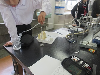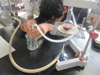 2日(火)4時間目、東理科室では1年生が混合物を蒸留する実験を行っていました。ワインを蒸留し、アルコールを採取します。枝付きフラスコにゴム管、ガラス管をつけ、バーナーで熱します。次第にブクブク泡立ち、気体になったアルコールがガラス管から試験管に流れ、それを取り出して冷やします。すると透明なアルコールを採取することができます。生徒たちは真剣に実験に取組んでいました。やはり実験は楽しいようです。