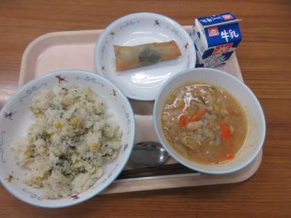 小松菜ピラフ、パリパリひじき、ミネストローネ、牛乳 完食キャンペーン3日目、今日のメインは小松菜のピラフ、刻んだ小松菜に、コーン、鶏肉、玉ねぎが入っていて、塩味がついています。とてもおいしいです。ミネステローネはトマト味、大麦、ニンジン、白いんげん豆、ズッキーニが入っていてピラフとの相性はバッチリです。食が進みます。パリパリひじきとは何かなと思ってみるとひじきの煮ものの春巻きです。外はパリパリ中はジュワ〜としていてこちらも美味しいです。これなら生徒も全部食べてしまうのではないでしょうか。3日目も完食、ごちそうさまでした。 delicious!