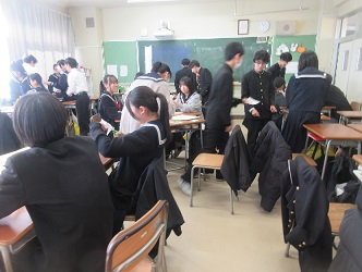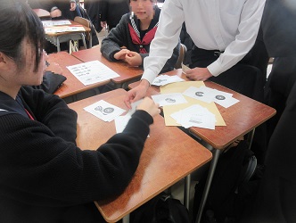 4日(木)2時間目、3年生の教室では生徒たちがワイワイ動き回っています。面白そうなので中に入ってみると自動車の売買を行っています。よく見るとパーツの売り買いです。先生が銀行になり、買いたい人たちに融資をしています。大量のタイヤ、エンジンなどを買い入れ、組み立てて販売します。たくさん作って売ると利益がでますが、市場にお金が出回りすぎると価格も上昇し、やがてインフレーションを引き起こします。そうすると買い控えがおこり、価格も下がってきます。銀行役の先生も一定期間になるとお金の回収をしていきます。市場経済の仕組みが盛り込まれた授業で、生徒たちも楽しそうに売買に参加して、経済活動を学んでいました。