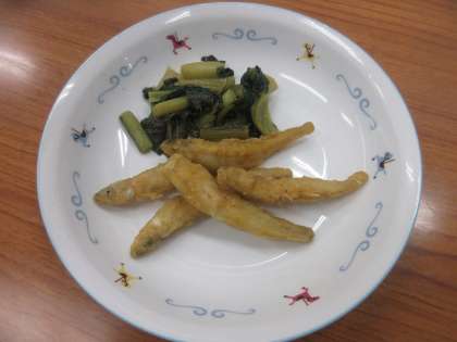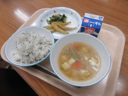 ごまごはん、ワカサギのカレー揚げ、野沢菜炒め、豚汁、牛乳 完食キャンペーン4日目、今日のメインはわかさぎのカレー揚げです。学校給食ではワカサギやシシャモといった小さくて骨を気にせず頭から食べられる魚が出てくることが多いです。今日のワカサギも頭からバリバリ食べられて骨を気にせず食べられます。カレー味をつけているので、生徒の中には普段食べなくても今日は食べるという生徒もいたようです。野沢菜はよく漬かった菜っ葉を油で炒め、塩も抜いてあり食べやすかったです。豚汁は豚肉、ジャガイモ、ニンジン、豆腐、コンニャクなどが一緒に煮てあり、いい出しがでています。ごはんには最高のごちそうです。寒い日に温かい豚汁、たまりませんね。今日も無事完食です。明日も食べて完全制覇です。