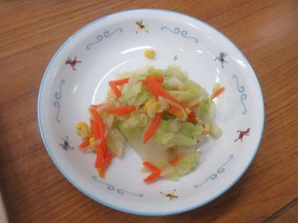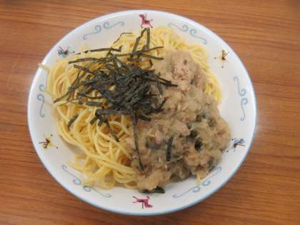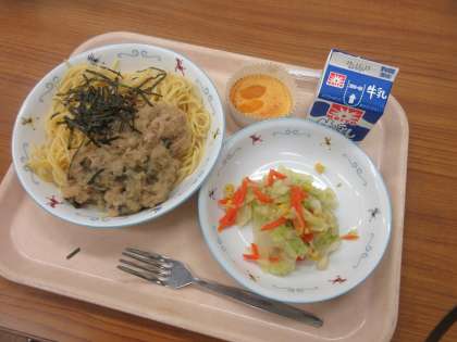 練馬スパゲティ、オレンジスフレ、コールスローサラダ、牛乳 食事をするいつもの部屋に入ると大根おろしと酢の匂いが立ち込めています。“これは間違えない あれだ!”そうです。今日は練馬スパゲティの日です。年に1回行われる練馬大根引っこ抜き大会で引っこ抜かれた大根が区内の小中学校に配られ、今日のメニューになっています。今日はパスタが大もりです。一口食べると大根と酢、パスタとノリがロンド(舞踏会)しています。大根おろしと酢の酸味が食欲をそそります。