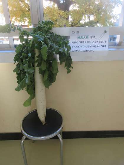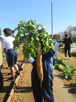 昨日I組が農業体験に出かけましたが、2年生も毎年“郷土の伝統と文化の尊重、郷土を愛する態度”ということで練馬を代表する産業“農業”を体験する学習を行っています。2時間目から6時間目、クラスごとに近くの農園に出かけて、大根掘りをさせていただきました。練馬といえば“練馬大根”江戸時代5代将軍徳川綱吉が“カッケ”治療ために栽培したと言われています。残念ながら練馬大根は栽培が難しく、練馬大根を掘ることは出来ませんが、今日はその代わりに“青首大根”を掘らせてもらいました。葉の根元を引っ張ると白い大根がニョッキと出てきます。とても美味しそうです。おでんやお鍋、煮物にすると味がしみてとても美味しいです。今日は持ち帰ってお家の方と一緒に食べたいと思います。貴重な体験ありがとうございました。