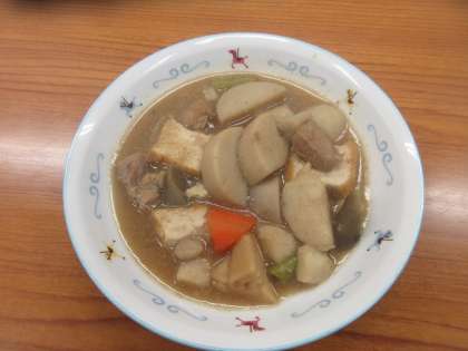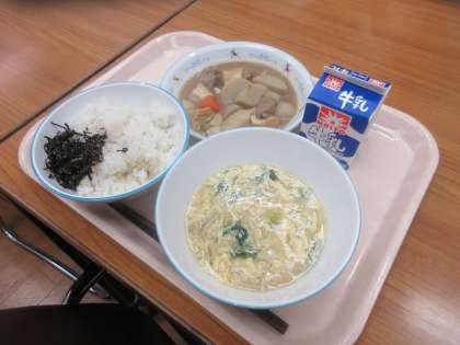 麦ごはん、ひじきふりかけ、里芋と豚肉の角煮、むらくも汁、牛乳 ひじきのふりかけがかかったごはん、最近食べることが少なかったので、とてもおいしくいただけました。里芋と豚肉の煮ものはねっとりした里芋と大きめの角煮がおいしさを拡大します。タケノコが入っていたのでこれもgoodでした。「むらくも」とはにわかに群がり集まる雲ということで、かきたま汁にはおしゃれで優雅なネーミングです。雅な気持ちでいただきます。今日も美味しくいただきました。