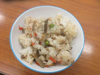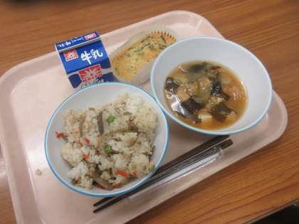 こぎつねごはん、ぎせい豆腐、わかめと豆腐のみそ汁、牛乳 こぎつねごはんは、油揚げ、ゴボウ、ニンジン、グリンヒースなどが入った混ぜごはんです。しょうゆ味がついていて食べごたえがあり、美味しいです。ボリュームありました。ぎせい豆腐は卵焼きのように甘くて中にはヒジキが入っていて、こちらも美味しくいただきました。よく噛んで食べた後、みそ汁で流し込みます。みそ汁にはわかめ、豆腐以外にも玉ねぎが入っていて甘く、今日の給食はやさいの甘さが際立ち、おいしくいただけました。