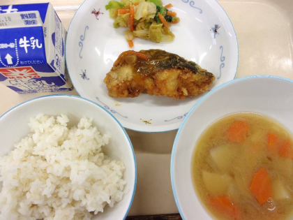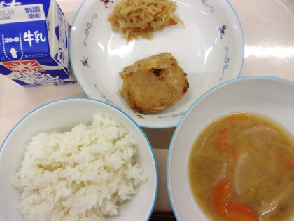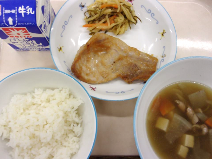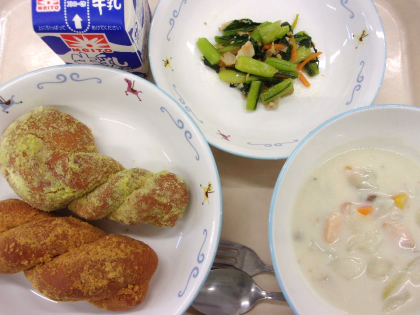 今日の主食は、パンです。給食準備の間に石けんを使ってきれいに手を洗いましたか? パンを食べる時は直接手で触るので、いつもよりていねいに洗い、きれいな手で食べましょう。