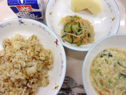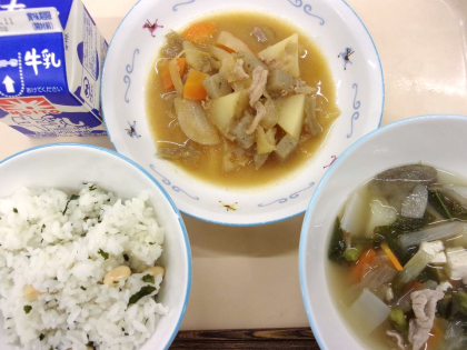今日の主食は「豆わかごはん」です。これは、わかめごはんに大豆が入ったごはんです。そこで問題です。!