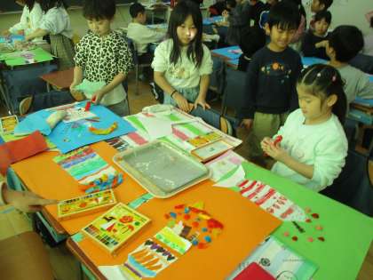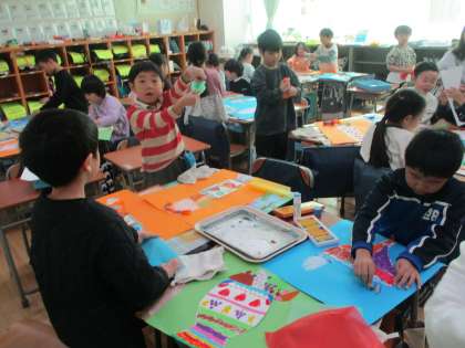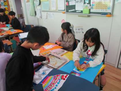 図工の時間では、『ぎゅっとしたい!わたしの「お友だち」』の作品作りをしています。 最初に作りたい『お友だち』を考え、一人一人設計図を書きます。次に設計図を元に、袋の形や色、材料の使い方を工夫して作っていきます。