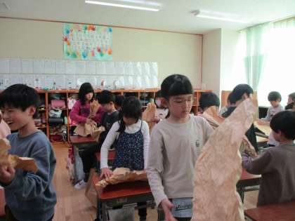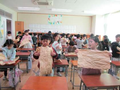 まず、クラフト紙の袋をくしゃくしゃにしました。くしゃくしゃにするには力は必要ですが、破らないように優しく、力の加減の調整をしながら行います。いい感じのものができ、近くの友達と「見て!くしゃくしゃになったよ。」「こんな感じどう?」と見せ合ったり比べたりする姿が見られました。次回はこの袋の中に中身を詰めたり、各自が用意した材料で装飾したりしていく予定です。どんな作品ができるか楽しみですね!