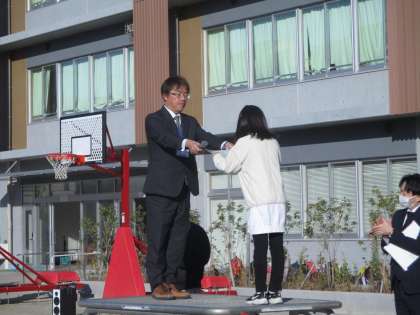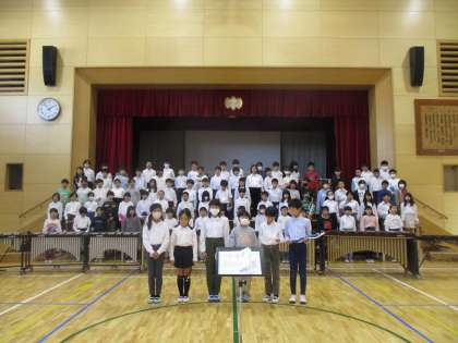 全校朝会では、「読書感想文コンクール」の代表児童表彰式でした。各学年から1名ずつ、代表児童の表彰をし、みんなでお祝いの拍手をしました。