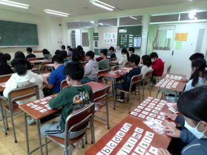4年生 外国語 アルファベットの学習では小文字のカードを使って、普段よく見る看板のつづりを確認して自分の机の上にカードを並べました。限られた時間の中で、しっかり確認して大文字から小文字に変換して並べることができました。