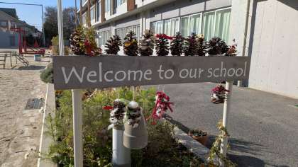 正門の花壇にゴールドクレストの木が2本植わっていますが、フラワーサークルの皆さんが季節に合わせた飾りつけをしてくださいました。