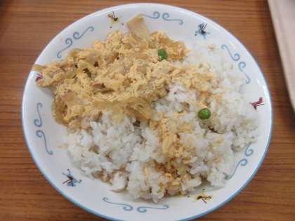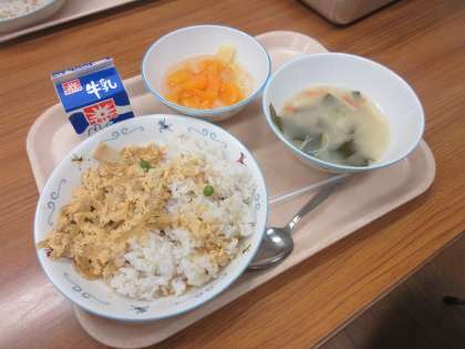 親子丼、わかめスープ、フルーツポンチ、牛乳 親子丼は鶏肉と卵です。最近は鮭とイクラの海鮮丼を親子丼ともいうそうですが、今日は鶏肉のオーソドックスな親子丼でした。丼の汁が余っていたので、汁だくにしていただきました。一口食べると口の中に卵と出汁の甘みが広がります。鶏肉は皮が取ってあり、下処理がきちんとされていました。グリンピースの緑、カマボコもおいしさをそそります。ワカメスープにはエノキ、タケノコ、ニンジンが入っていて、野菜たっぷりです。スプーンですすっていただきました。フルーツポンチには缶詰のミカン、モモ、パインと寒天が入っていて密の甘さが際立ちました。子どもの頃はあまり寒天は好きではなかったのですが、大人になって食べるとおいしさがわかります。寒天にも甘さがしみていました。今日も完食です。
