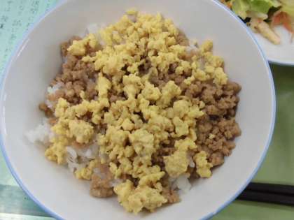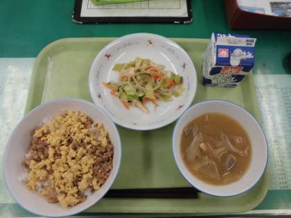 今日のメニューは、二色丼・ごま和え・呉汁・牛乳でした。二色丼は見た目も鮮やかで、肉の旨味と卵のほのかな甘さでご飯がすすみました。ごま和えは、噛みしめるごとにごまの風味が生きていましたね。呉汁は大豆が加わることで、風味もボリュームもアップしていました。寒い季節にはうれしいメニューです。