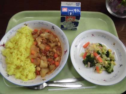 今日のメニューは、ターメリックライス・チリコンカン・ブロッコリーのサラダ・牛乳でした。今日はメキシコ由来のアメリカ生まれと言われているチリコンカンでした。大豆やさいの目に切られたじゃがいもなどがたっぷり入っており、よく煮込まれた味わいがターメリックライスにぴったりでした。ブロッコリーのサラダは、食べ応えもあり、さっぱりした味わいが、チリコンカンといいバランスでした。