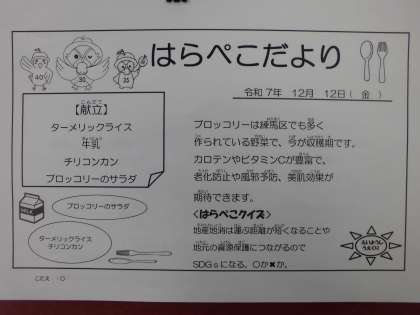 ブロッコリーは、学校内の花壇でも栽培されています。売り物のように大きくはありませんが、立派なブロッコリーができています。先日の学校日記でも書きましたが、近年急激に身近な野菜となりましたね。栄養価に優れ、様々な料理に使いやすく、癖が少なくて食べやすい野菜であることが大きいかもしれません。寒くなる今が収穫期ですので、ぜひ新鮮なブロッコリーを、ご家庭でもたくさん食べてみてください。