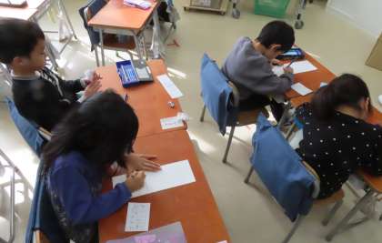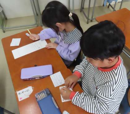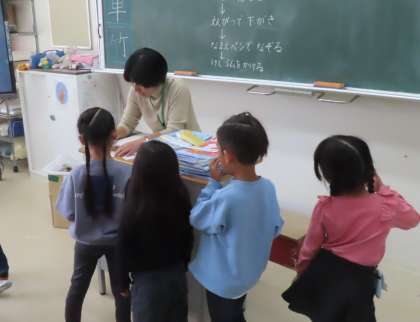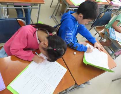 来週の町探検準備をしています。お店や施設に行って何を質問するか、ワークシートに書き出しています。これからクラスを越えて相談です。