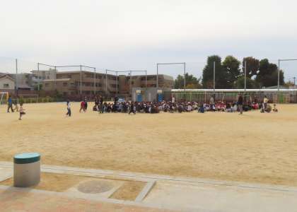 休み時間の地震の想定。校舎から離れて集まる、校舎からは防災頭巾をかぶって出る。ざわつく中でも黙って行動できた人は立派でした。