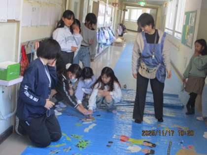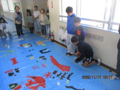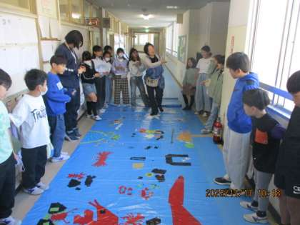 そのことを生かして、展覧会の共同制作として 図工と総合学習のコラボで 「白子川への思いを込めて」 みんながいる白子川の様子を協力して表現しています。 完成が楽しみです。