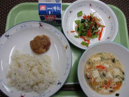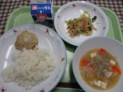 ・れんこんつくね焼き ・野菜のごま和え ・みそけんちん汁 ・牛乳 11月19日