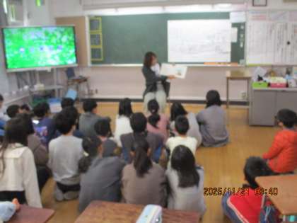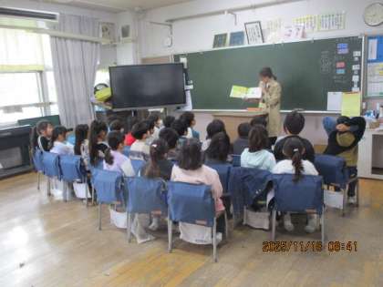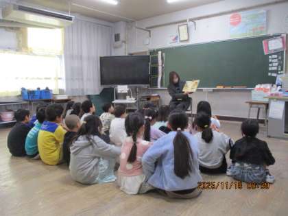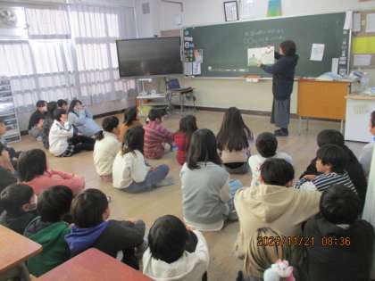 保護者の方に読み聞かせをしていただきました。 高学年の子供たちも、嬉しそうで 話に引き込まれるように聞いています。