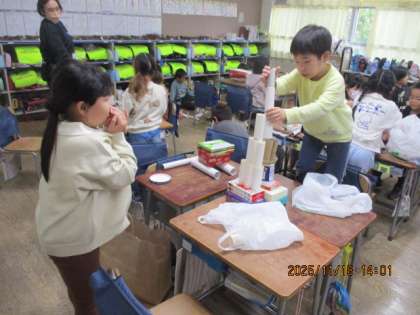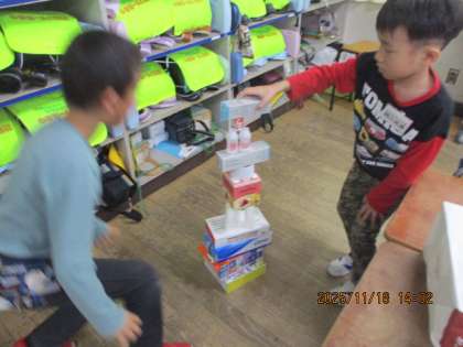 子供たちが持ってきた箱や筒 積み重ねて遊んでいます。 どれだけ高く積み重ねられるかチャレンジしているようです。 遊びながら箱の形について どんなことに気づいたかな???