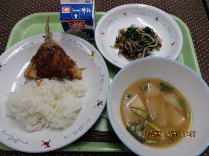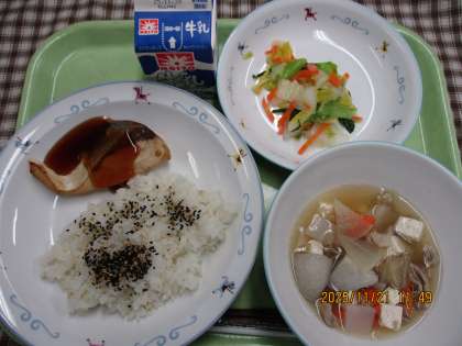 ・ぶりの照り焼き ・白菜と小松菜の甘酢和え ・根菜の具沢山汁 ・牛乳 11月20日