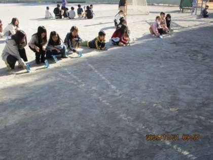 太陽の光を反射させて光の進み方を調べています。 的に当ててみたり 地を這わせてみたりして 光がどのように進むのか分かったようです。